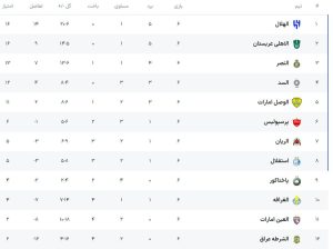 پرسپولیس با ۶ امتیاز و الریان و استقلال تهران هم با ۵ امتیاز تیمهای ششم، هفتم و هشتم جدول هستند. پاختاکور ازبکستان و الغرافه قطر با ۴ امتیاز و العین امارات و الشرطه عراق با ۲ امتیاز در ردههای نهم تا دوازدهم جدول قرار دارند.