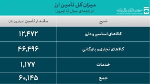 در این مدت برای کالاهای اساسی و دارو ۱۲ میلیارد و ۴۷۲ میلیون دلار، برای کالاهای تجاری و بازرگانی مبلغ ۴۶ میلیارد و ۴۹۶ میلیون دلار و برای خدمات ۱ میلیارد و ۱۷۷ میلیون دلار تأمین ارز صورت گرفته است.