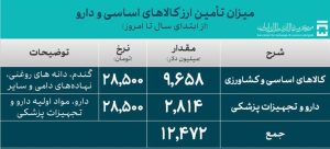 بر اساس این گزارش، بانک مرکزی برای واردات کالاهای اساسی و کشاورزی ۹ میلیارد و ۶۵۸ میلیون دلار و برای دارو، مواد اولیه دارویی و تجهیزات پزشکی ۲ میلیارد و ۸۱۴ میلیون دلار ارز تأمین کرده است و در مجموع طی مدت مذکور ۱۲ میلیارد دلار و ۴۷۲ میلیون دلار برای کالاهای اساسی و کشاورزی و دارو و تجهیزات پزشکی را با نرخ ۲۸,۵۰۰ تومان و با هدف حمایت از مصرفکنندگان و دسترسی اقشار جامعه به کالاهای ضروری با قیمت ارزانتر تأمین شد.